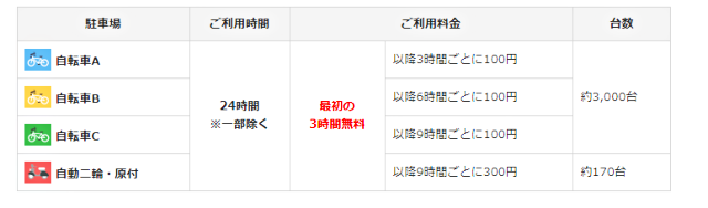 コクーンシティの自転車の駐輪場代は、最初の3時間までは無料です。