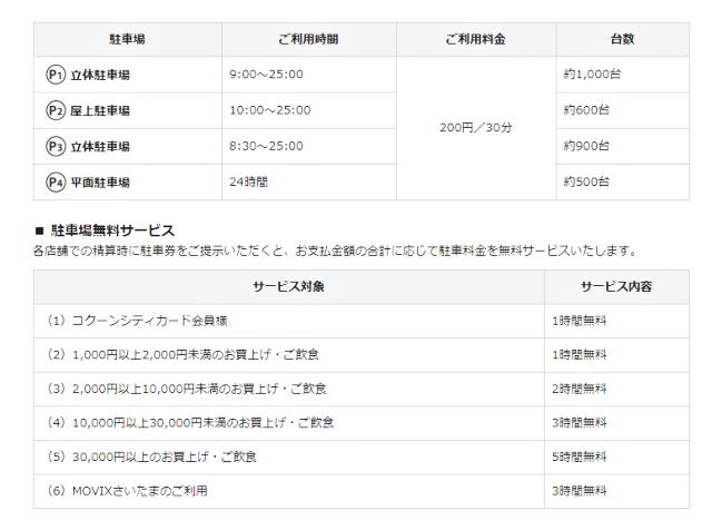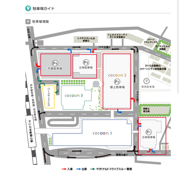 コクーンシティの駐車場は、立体駐車場(P1、P3)、屋上駐車場(P2)、平面駐車場(P4)の全部で4つあります。台数も3,000台収容できます。