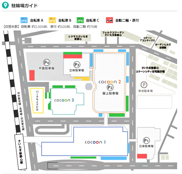 コクーンシティへ自転車やバイクで行く場合、駐輪場も充実しています。全部で4箇所あり、自転車3,000台、バイク170台分の駐輪スペースがありますよ。