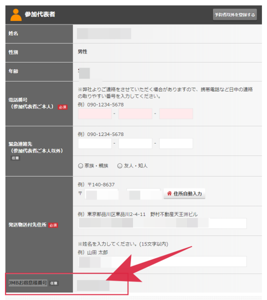 会員の場合、ログインして航空券の予約すれば、「JMBお得意様番号」がすでに入っているので、このように自動でマイレージが登録されます。