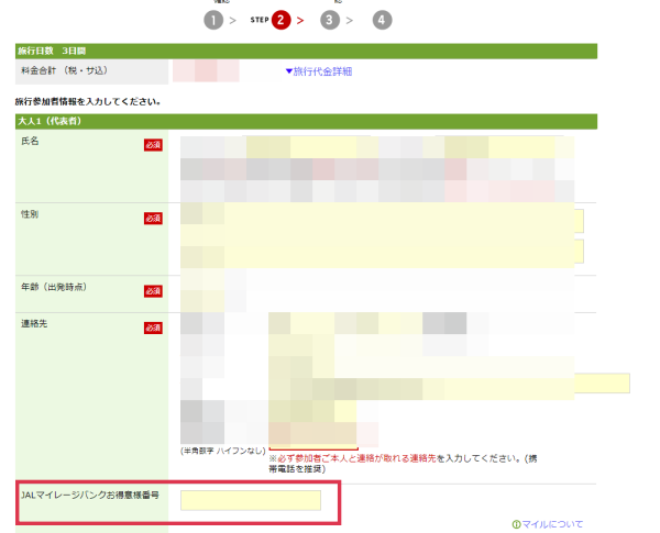 JALのウェブサイトで予約する場合、個人情報を入力するページの下に、マイレージの会員番号を入力するようになっています。