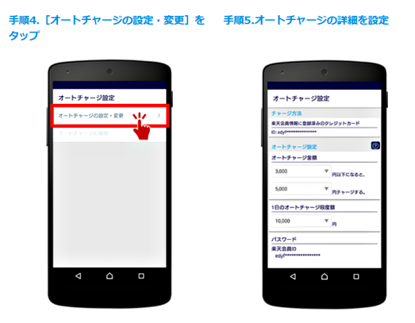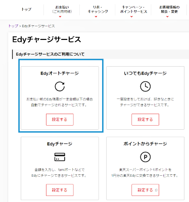 初めて楽天Edyのオートチャージを設定する方法には、Edy機能付き楽天カードの場合と、おサイフケータイの場合とがあります。