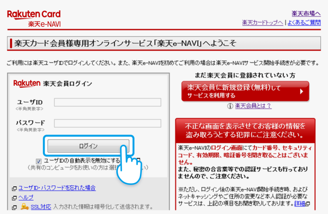 まず、最初にオートチャージを申し込みます。申込みは、楽天カード会員専用のサイト「楽天e-NAVI」からできます。