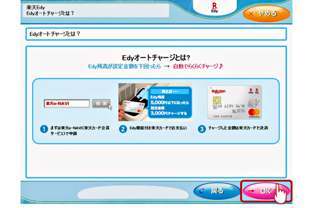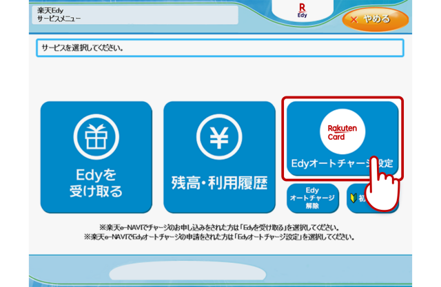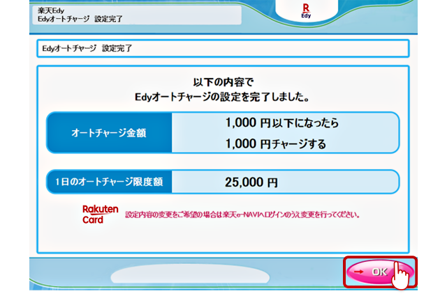 楽天e-NAVIのEdyオートチャージ申し込み完了画面から、「パソリ」を選択→「楽天Edyリーダー」または、「パソリ」にEdy機能付き楽天カードをセット→準備完了ボタンを選択→設定完了です。
