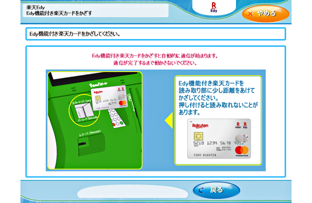 ④読み取り部分にEdyカードをかざすと通信がはじまります。