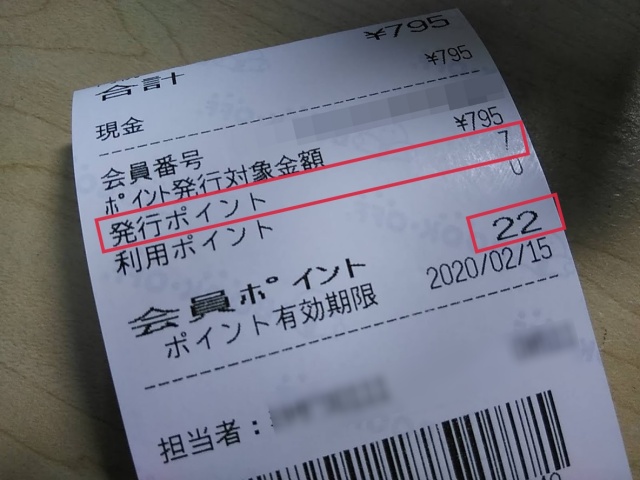 下のレシートの場合、7ポイント付いて、累計で22ポイントあることがわかります。