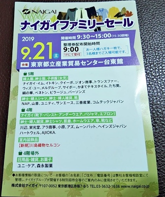 僕の場合、以前、知り合いから招待状をもらい、会場に行ったときにナイガイファミリーセールの会員に登録したので、今回は、招待状を持って行ってきました。