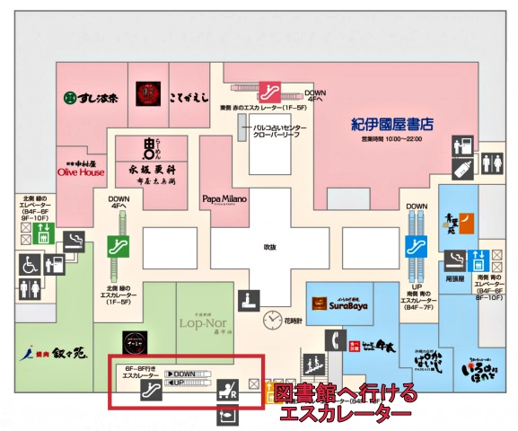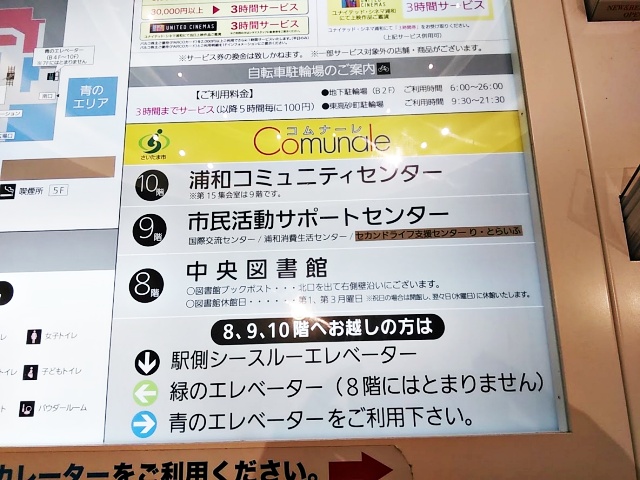 図書館には、エスカレーターでも行けます。ただし、こちらの浦和パルコの5階のフロアマップを見てもわかるように、エスカレーターで5階まで行くと、そこで別のエスカレーターに乗り換えなくちゃいけません。