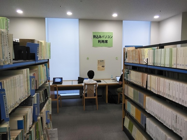 ここは、あくまでも図書館内の本や資料を読むための席です。パソコン、電卓は使えません。