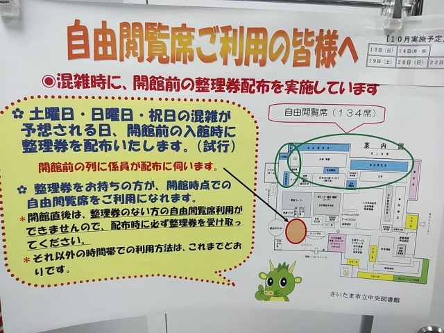 浦和パルコの図書館「さいたま市中央図書館」のとくに自由閲覧席は、土日、祝日はかなり混雑します。そのため、混雑時には開館前に整理券を配布しています。