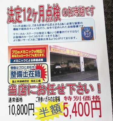 まずは、法定12ヶ月点検というのは、法律で決められているもので車検と車検との間に行う点検です。