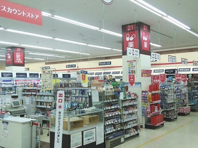 オリンピック武蔵浦和店の薬局コーナーです。化粧品やシャンプー、リンスなどもあり、日用品も揃っています。