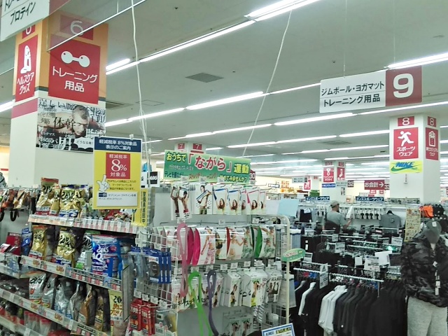 スポーツ用品のコーナーです。スポーツウェア以外にも、本格的なトレーニング用具などもあります。