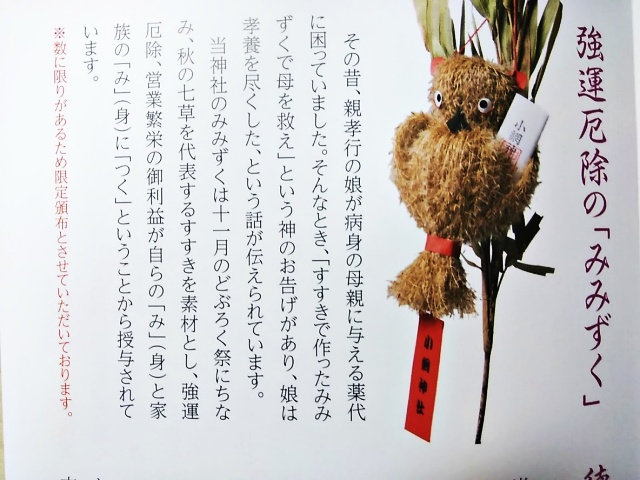 ちなみに、このみみずく御守ですが、小網神社で11月に行われるどぶろく祭で配られるすすきタイプの「みみずく」にあやかったものです。
