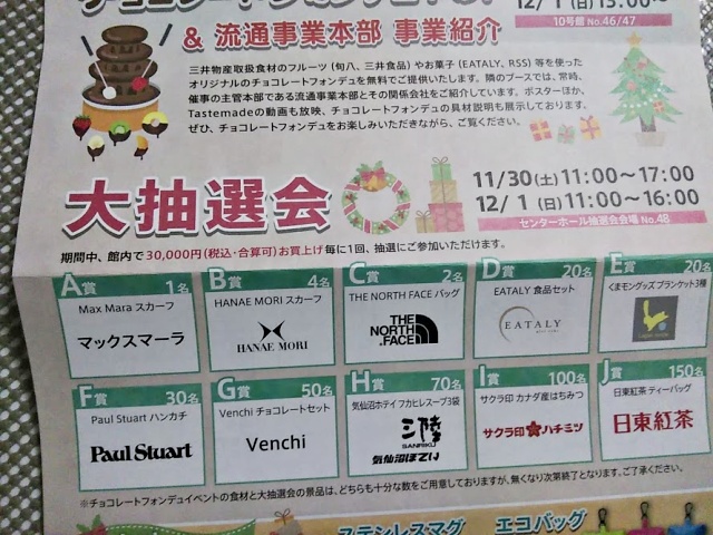三井物産のファミリーセールでは、税込み30,000円以上購入すれば、抽選会に参加できます。景品は、A賞からJ賞まであり、マックスマーラのスカーフから、ノースフェイスのバッグや日東紅茶のティーバッグなどが当たります。また、賞に漏れた方でも、オリジナルのステンレスマグカップやエコバッグが当たります。