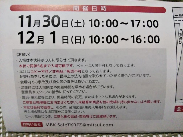 今回の、三井物産のファミリーセール「ウインターセール」の日程は、11月30日(土)、12月1日(日)の2日間でした。