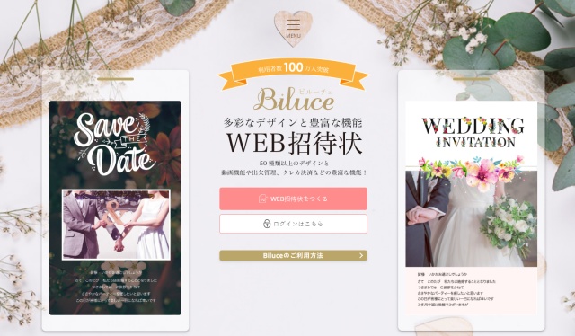ビルーチェは、ご祝儀まで事前に決済できるサービスがあるのが大きな特徴です。また、12種類の招待状テンプレートが用意されているので、スマホから自分の好きなデザインを選ぶだけです。写真や動画も自分が用意したものが使えるので、オリジナル招待状も簡単に作れますよ。2017年3月1日にリリースしたばかりの、新しいWEB招待状サービスです。