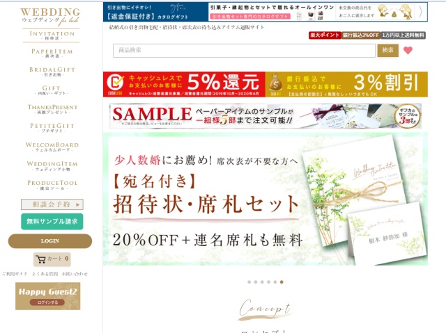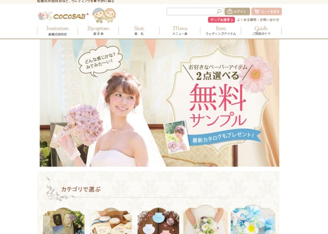 ココサブは、かわいいデザインが多いと評判です。1カップルにつき2点まで好きなデザインの無料サンプルと最新カタログがもらえるのも嬉しいです。オリジナルで手作り派向けの「手作りキット」と印刷込みの2種類のペーパーアイテムが揃っています。ココサブでは、いろいろな割引特典があるので、上手に利用すると価格的にもかなり節約できますよ。