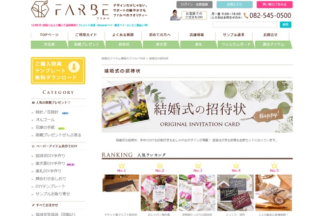 FARBE(ファルベ)は、オンラインショップの他に実店舗があります。どちらもサポートがしっかりしているので、わからないことがあれば丁寧に対応してくれます。ネットの場合、10,000円以上(税抜)のお買い上げで送料無料です。また、手作りセット購入者限定で、サンプル(有料、無料)とレイアウトの代行サービスがあります。デザイン力が高いのでこだわりの招待状や席次表が作れると評判が高いですよ。