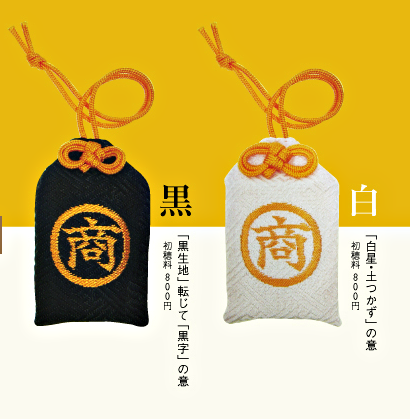 商いのお守りということで、商売繁盛、千客万来の効果が期待できるもので白と黒の2種類あります。
