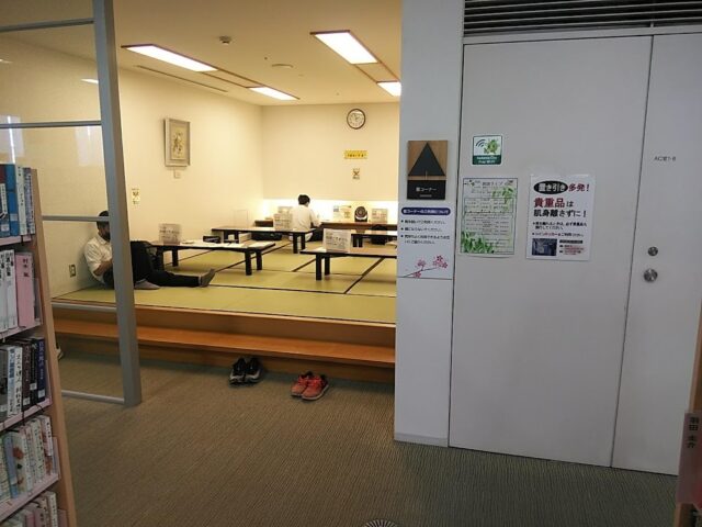 桜図書館の自習室には「畳コーナー」があります。椅子よりも畳の方が落ち着いて勉強できるという方におすすめです。奥にはカウンターもあります。