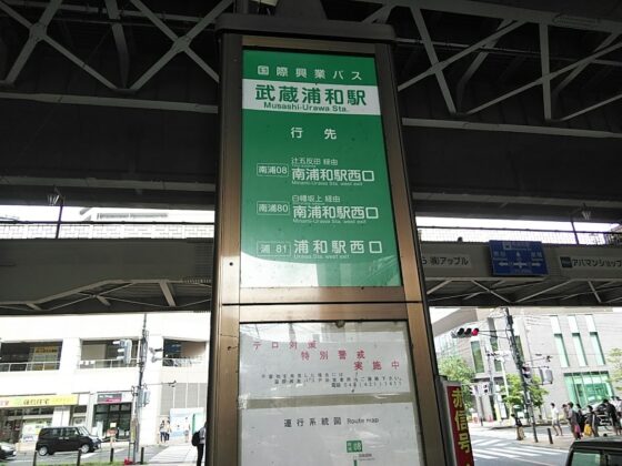 バス停は、武蔵浦和駅東口を出たスクランブル交差点の手前付近、高架下にあります。