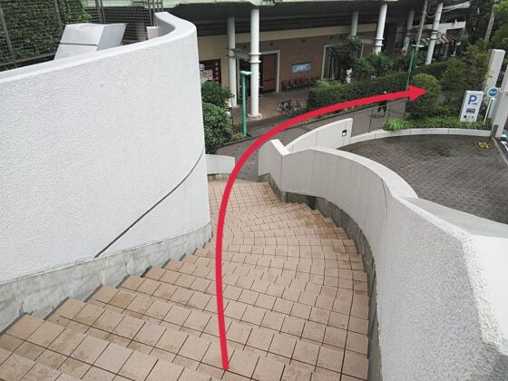 ひたすら、道なりに歩くと階段があり、その階段を降り、右折します。