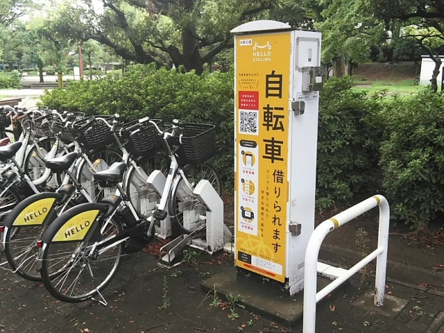 夜の公園内には、「HELLO CYCLING」のレンタサイクルサービスがあります。24時間利用可能なので便利ですよ。