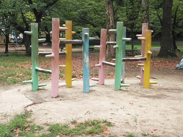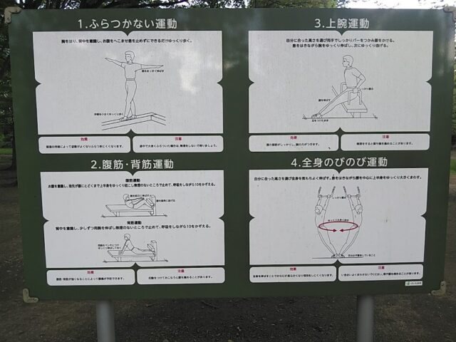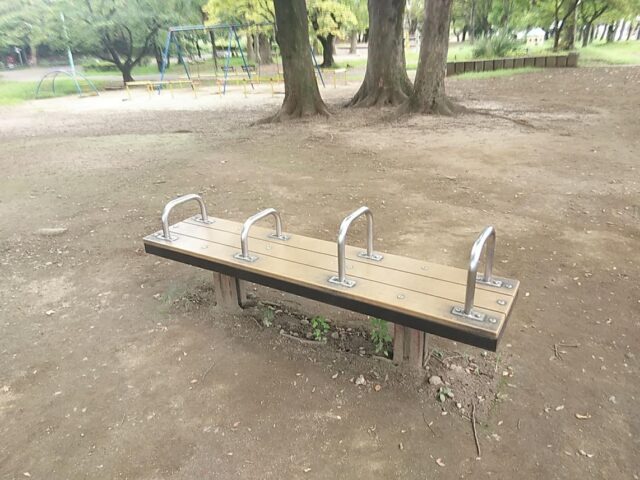 児童公園のそばには、日頃の運動不足解消や健康チェックができるようなアスレチックの道具があります。