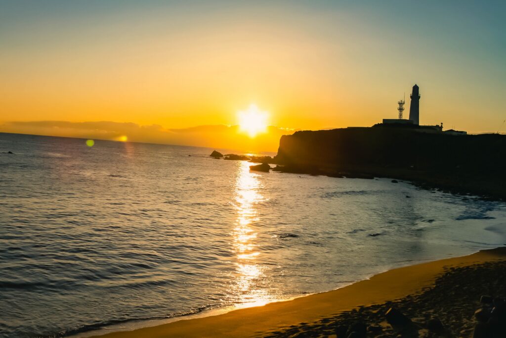 灯台から少し離れた広い海岸で、視界が開けているため日の出が見やすい場所です。