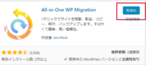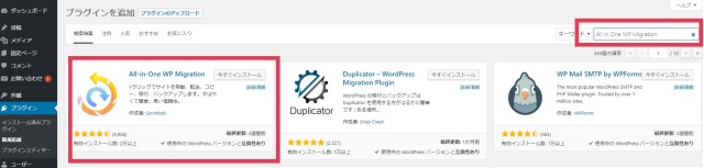 次に、検索ボックスに「All in One WP Migration」と入力→「今すぐインストール」→「有効化」