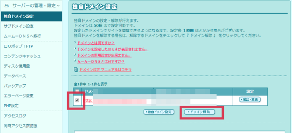 次に、移転元のロリポップのサーバーに設定している独自ドメインをいったん削除します。削除するドメインを選び、「ドメイン削除」をクリックします。