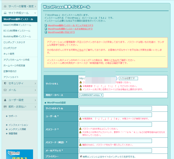 ロリポップの管理画面から、ワードプレスをインストールしサイトを作ります。