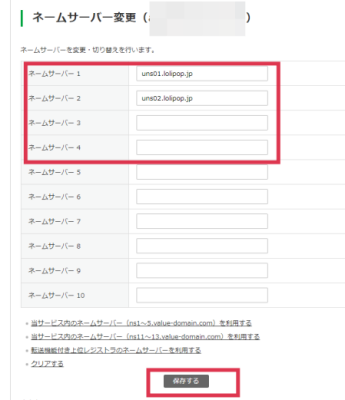 次にドメインのネームサーバ変更の画面から、赤枠部分に移転先のサーバーのネームサーバー情報を入れ、保存するをクリックして完了です。